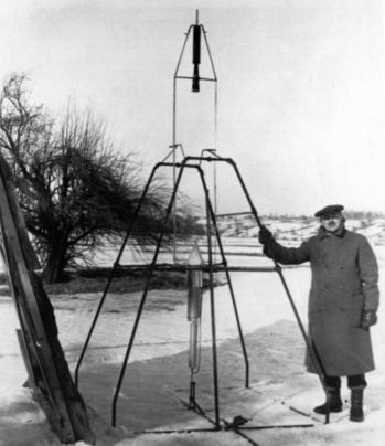 Die erste Flüssigkeitsrakete der Welt mit ihrem Erbauer