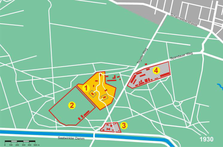 Der Ort: Das Gelände des Raketenflugplatz BerlinEin ehemaliges Munitions-Lager-Gelände im Norden Berlins wurde Rudolph Nebel und seinen Mitstreitern von der Heeresverwaltung ab September 1930 für eine symbolische Miete zur Verfügung gestellt. Hier entstand durch eine freiwillige Arbeitsgemeinschaft erstmalig eine Organisation mit technischer Infrastruktur, Entwicklung, Finanzbeschaffung und Öffentlichkeitsarbeit - die erste wirklich arbeitende Raumfahrtorganisation der Welt! Vom Raketenflugplatz Berlin existiert heute Nichts mehr. Seit der Blockade 1948 überdeckt der Flugplatz Tegel die nördliche Hälfte des alten Areals, die andere Hälfte ist größtenteils neu bebaut.Im Jahre 1930:1) Raketenflugplatz Berlin2) Schießplatz Tegel3) Chemisch-Technische Reichsanstalt4) Polizeikaserne Tegel