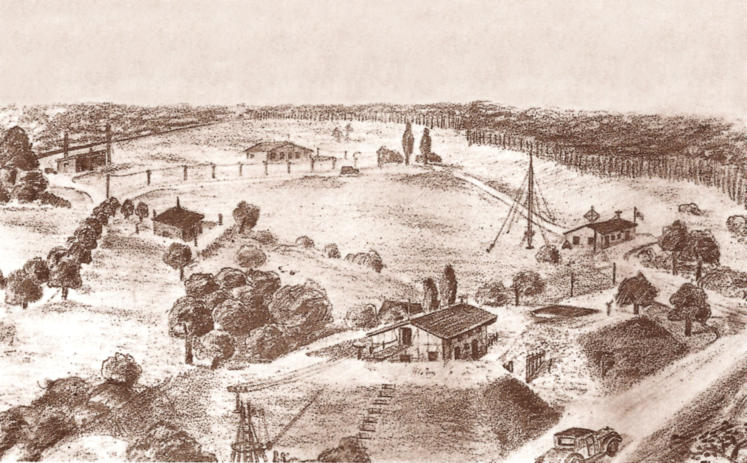 In der Skizze des Raketenflugplatz von etwa 1932 ist vorne das alte Startgestell der UfA-Rakete zu sehen, welches zum Teststand umgebaut wurde. Rechts dahinter das große Gebäude, von dem aus über Seilzüge der Testbetrieb gesteuert wurde. Hinten rechts steht das Büro-Gebäude mit dem Antennen-Kreuz auf dem Dach.